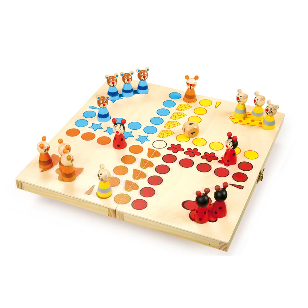 Класическа игра в забавен дизайн – тук играчите преследват целта с фигурки на животни! Има и друга особеност - зарчето е с цифри, а не с точки!