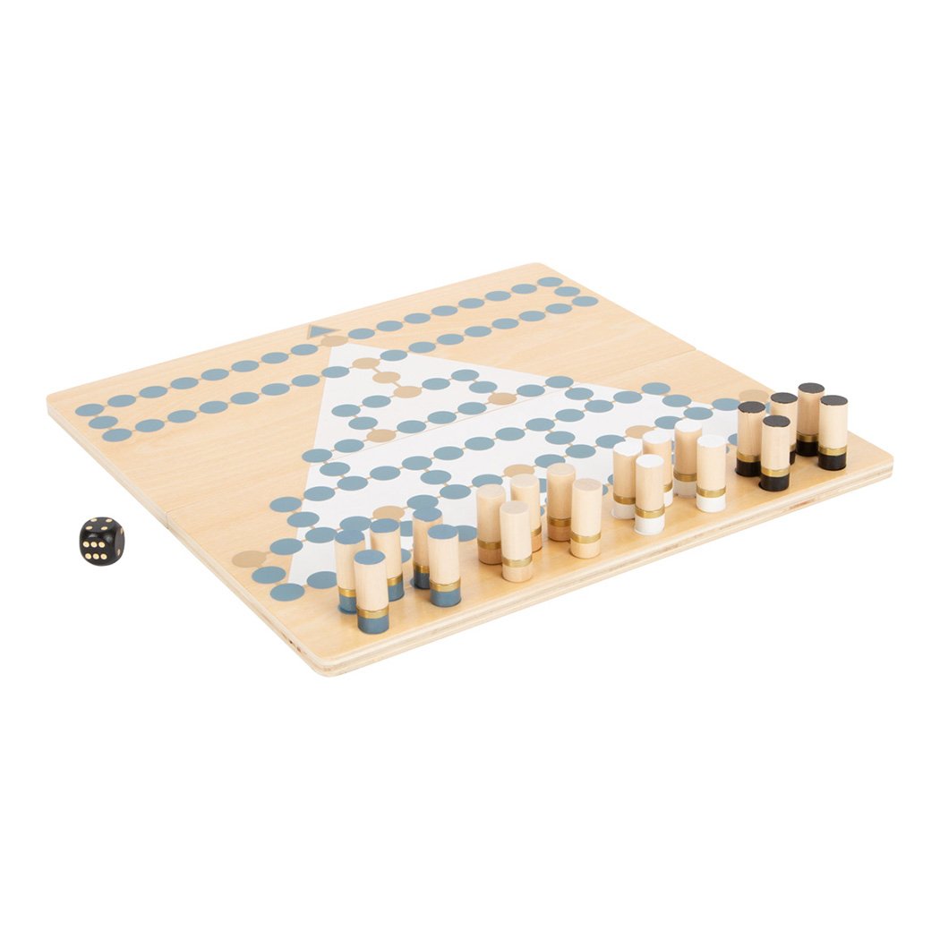 • Тази настолна игра 2 в 1 e с модерни златни акценти, опушено синьо в комбинация със семпло черно-бяло и много дървени елементи.