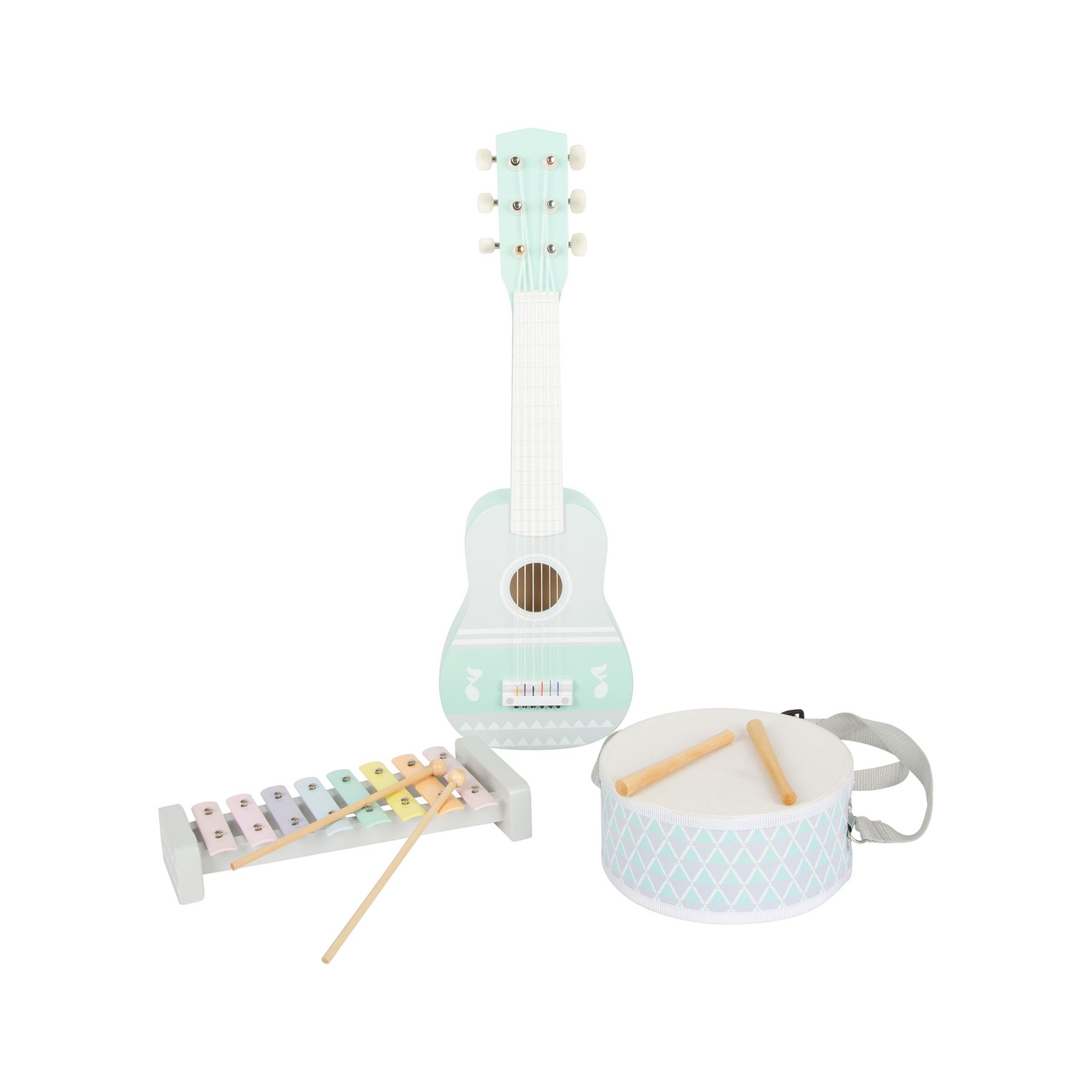 Комплектът от музикални инструменти, състоящ се от китара, ксилофон и барабан в нежни пастелни цветове, осигурява уникални музикални забавления. Трите атрактивно проектирани инструмента не само ще превърнат детската стая в концертна зала, но и ще бъдат атрактивен акцент! С тези музикални инструменти децата могат да се потопят в света на музиката и да се докоснат до първите си преживявания с ритъм и звук. Инструментите насърчават детското творчество.