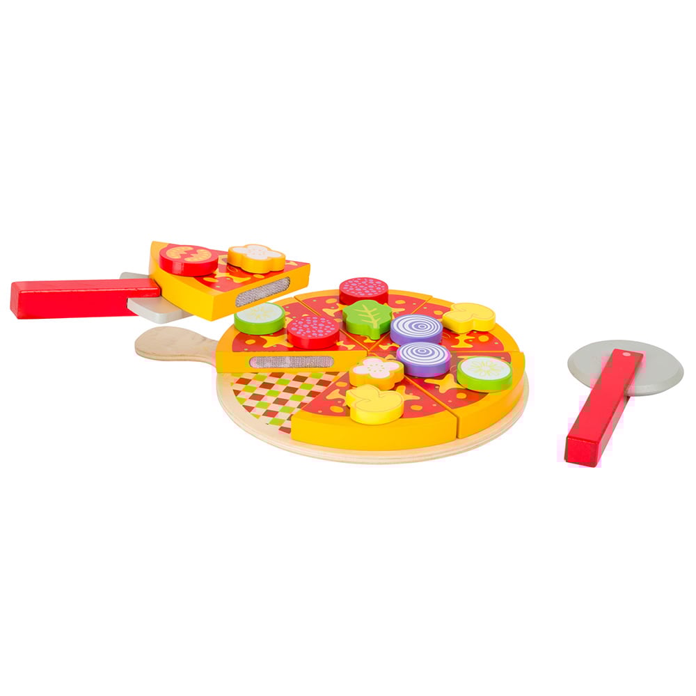 Добавете гарнитура към вашата пица и изпълнете желанията на всеки любител на пицата! Парчетата пица са свързани с велкро и могат да бъдат отделени с включения нож за пица, така че всеки да може да получи парче. Пицата може да бъде поднесена на гладните гости на дървения поднос и да се сервира. Играта предоставя страхотна възможност за развитие на креативност и социални компетенции. Кой иска парче пица?