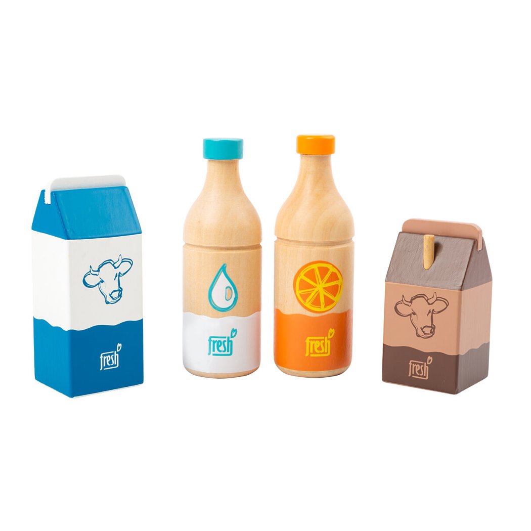 • Този дървен комплект от четири части съдържа бутилка портокалов сок, бутилка вода, кутия с мляко и малка кутия с какао. С дизайн, изразен в опростени илюстрации, тези играчки са напълно подходящи за малки деца, които все още не могат да четат.