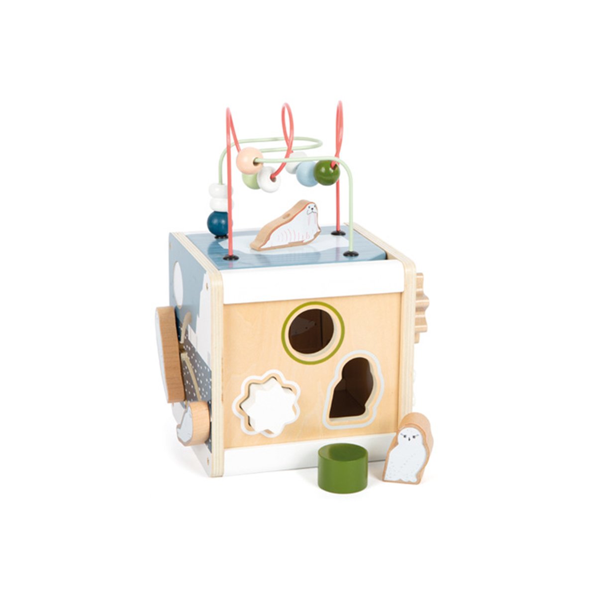 Два лабиринта с мъниста, подреждане на форми, плъзгащ се лабиринт, въртящи се плочки и зъбни колела осигуряват дълготрайно забавление и развитие на основни фини умения.