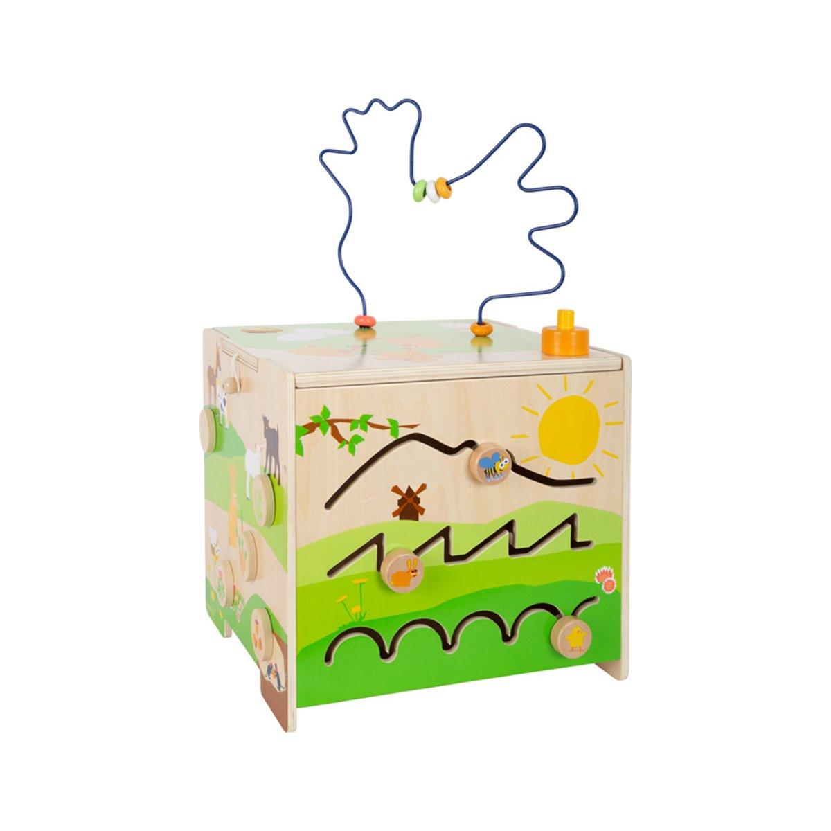 Този мултифункционален активен куб предлага разнообразие от занимания от петте си страни. Съдържа лабиринт с мъниста, сортиране на форми, пъзел за плъзгане, предизвикателство за подреждане на цветове, чук за игра и свирка. Когато капакът, който е закрепен с ключалка се обърне и постави вътре в куба, той се превръща в стабилно детско столче!