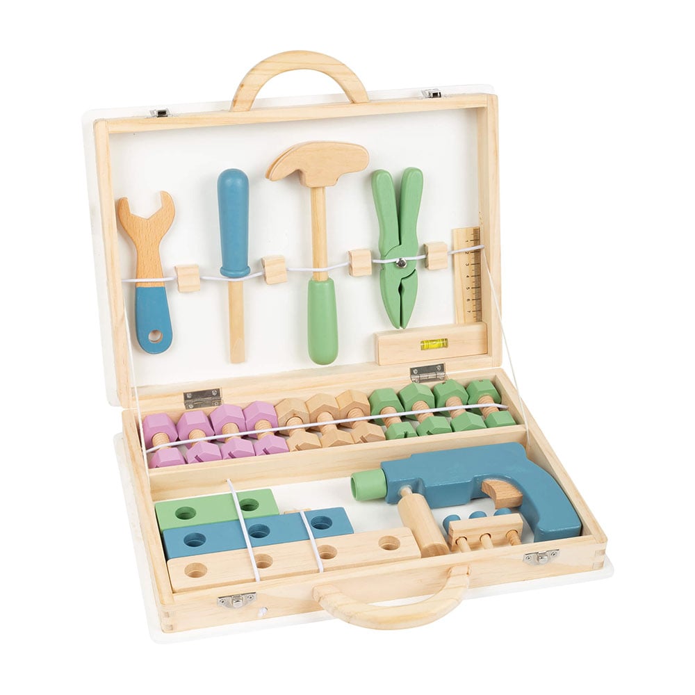 Благодарение на дървеното куфарче с инструменти младите занаятчии ще станат истински професионалисти. Аксесоарите като линийка, отвертка, клещи, чук ще направят играта изключително реалистична!
