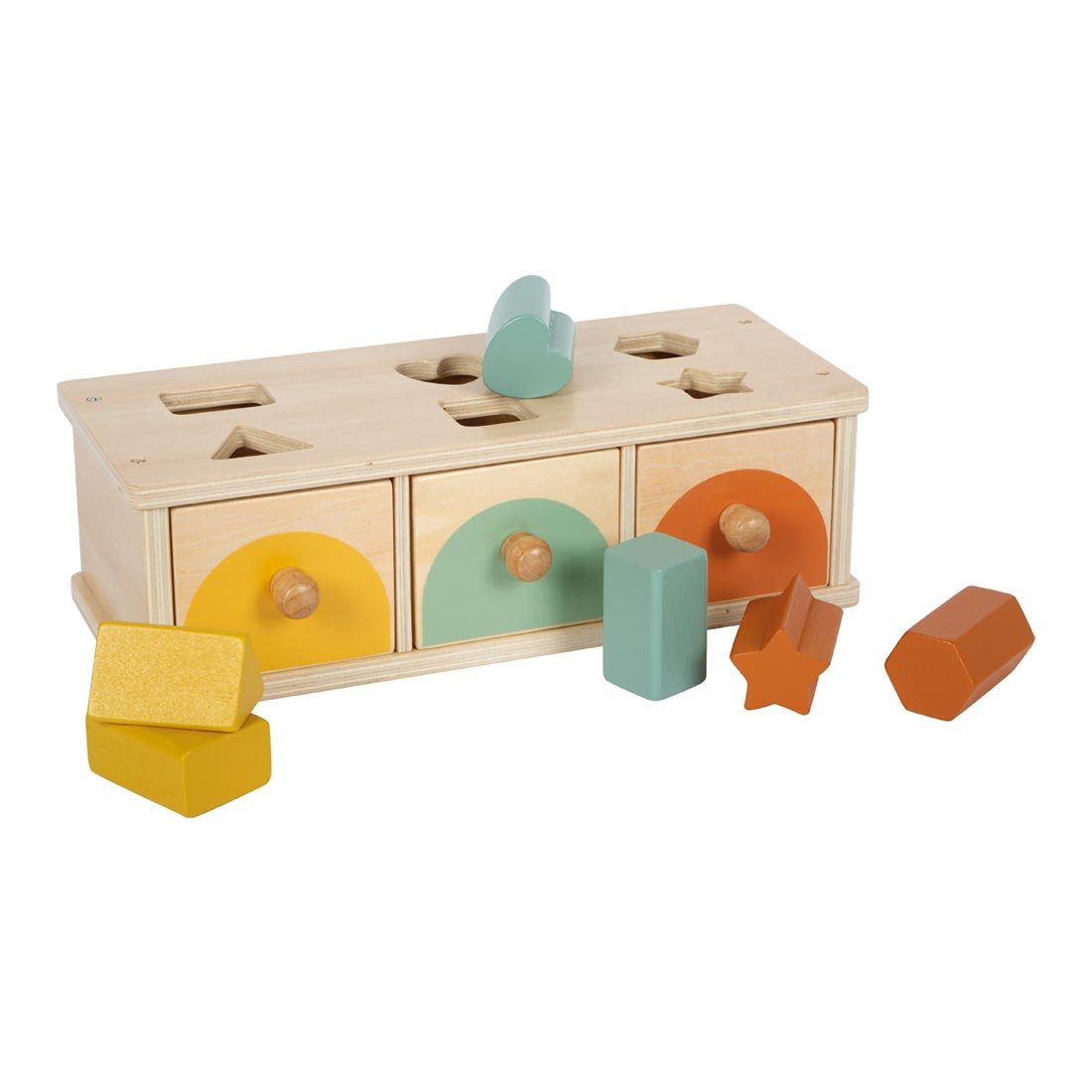 Тази вдъхновена от Монтесори кутия за сортиране приканва малчуганите да съчетават форми и да откриват цветовете чрез издърпващи се чекмеджета и обемни блокчета. Гладката, заоблена FSC® дървесина я прави безопасна, тактилна и увлекателна.