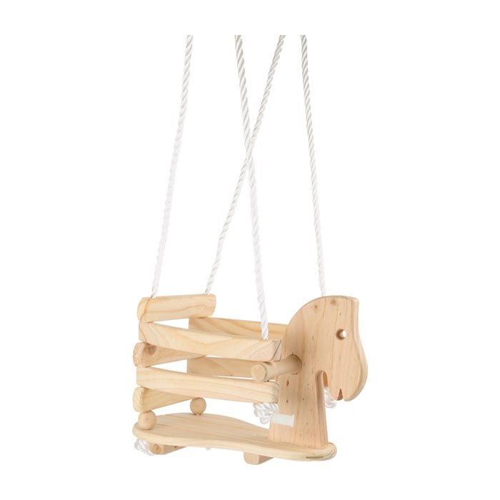 • Изработена е от естествено дърво, а конската глава осигурява сигурно задържане, докато се люлее високо към небесата.