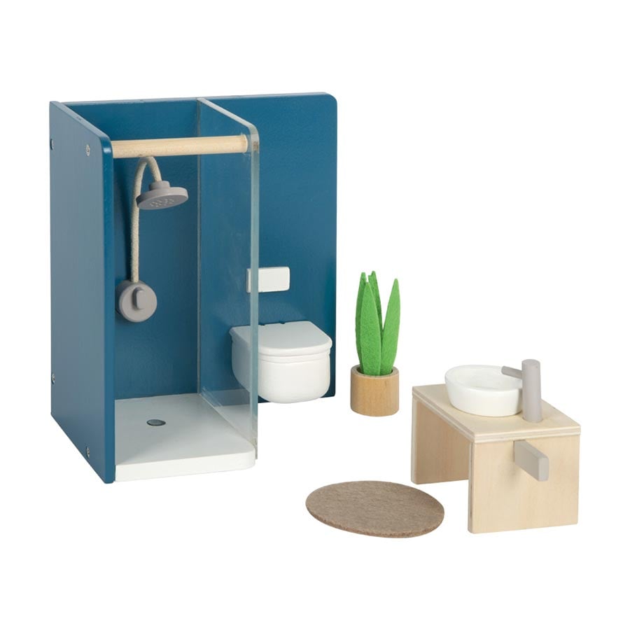 - Комплект мебели за баня: В този комплект ще намерите всичко необходимо за една напълно обзаведена баня за кукли – мивка с огледало, тоалетна, душ и шкаф за съхранение на аксесоари. Всеки елемент е прецизно изработен от дърво, което гарантира здравина и дълготрайност.
