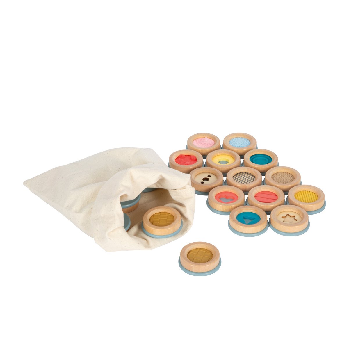 Докосване, разпознаване, сортиране! С тази тактилна игра на паметта целта е да докоснете различни повърхности, да откриете еднаквите и да ги свържете в двойки. Играта има 28 игрални фигури с 14 различни повърхности.