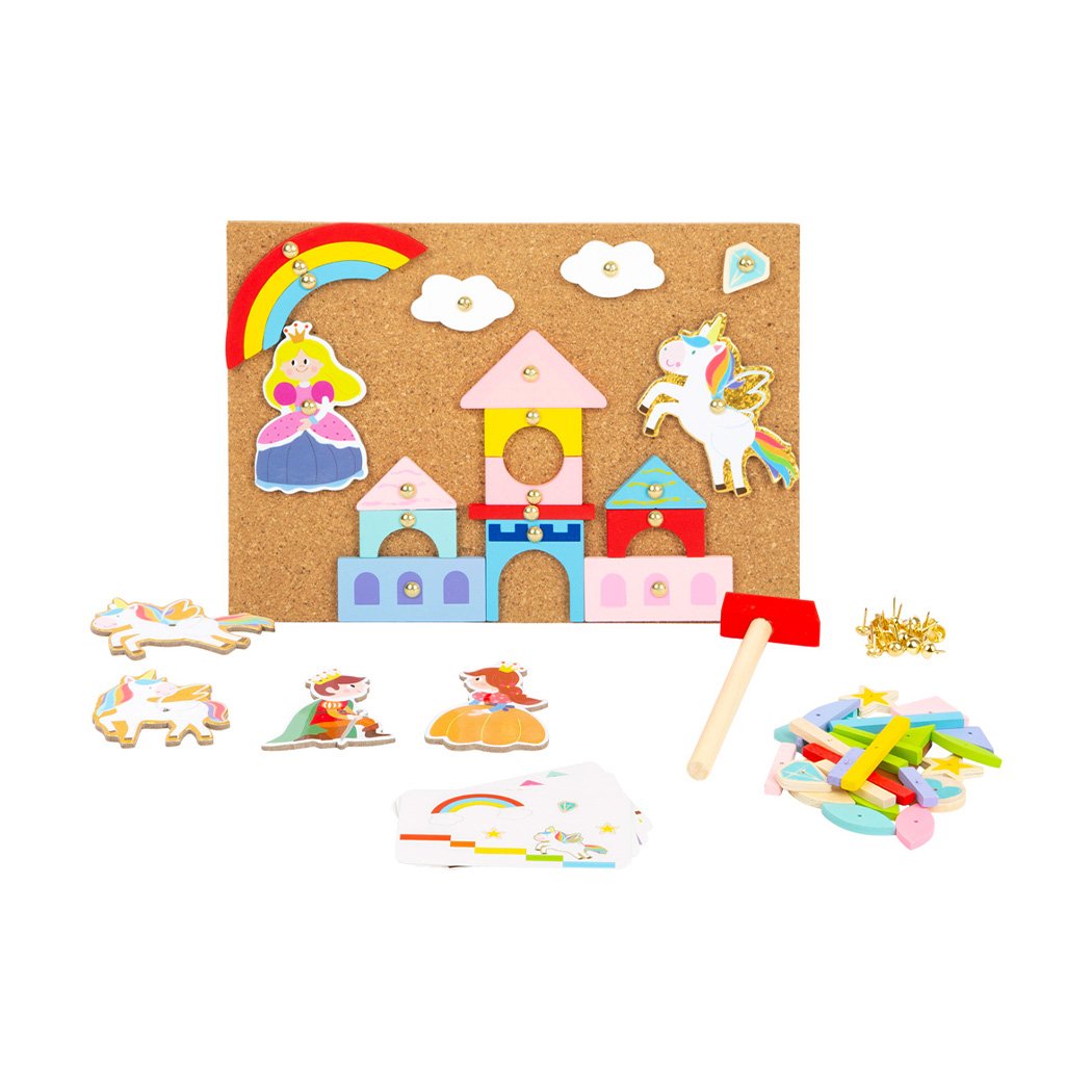 • Оборудван комплект с коркова дъска, два малки дървени чука, 100 малки пирона и 126 цветни дървени парчета ви дават начален сигнал за създаване на ваша собствена индивидуална картина.