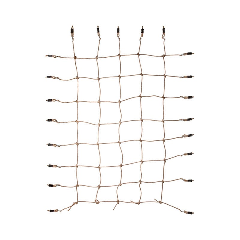 • Няма ограничения за забавлението с тази здрава мрежа за катерене с естествен вид на въже. Предлага се с ръчно завързани възли, отворени примки и стабилни куки за лесно и гъвкаво монтиране върху дървени рамки и катерушки.