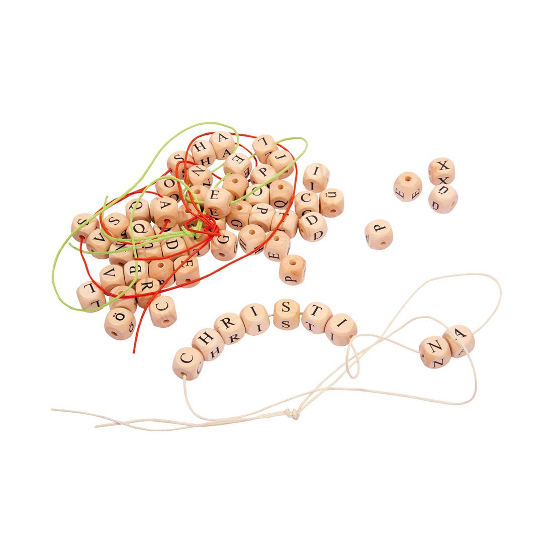 • Дървените зарчета с букви могат лесно да се нанизват върху включените четири цветни въженца, така че можете бързо да образувате страхотни вериги с имена и други комбинации от думи.