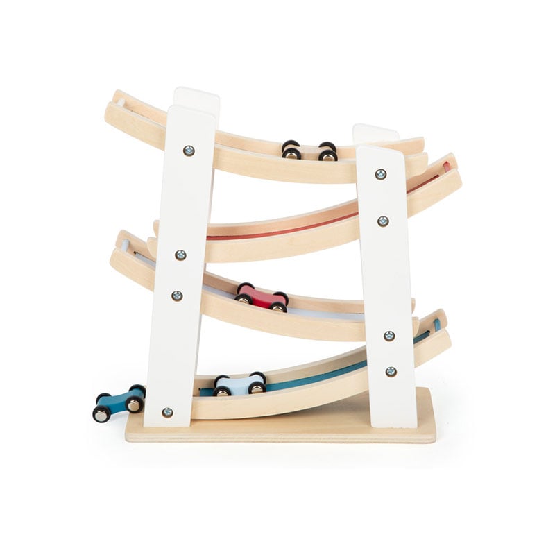 • Дървена състезателна писта със стабилна основа. Осигурява бързина на четирите малки дървени колички, които се спускат по рампите. По време на пътуването си от етаж на етаж, количките изпълняват забавни салта и доставят много забавление.