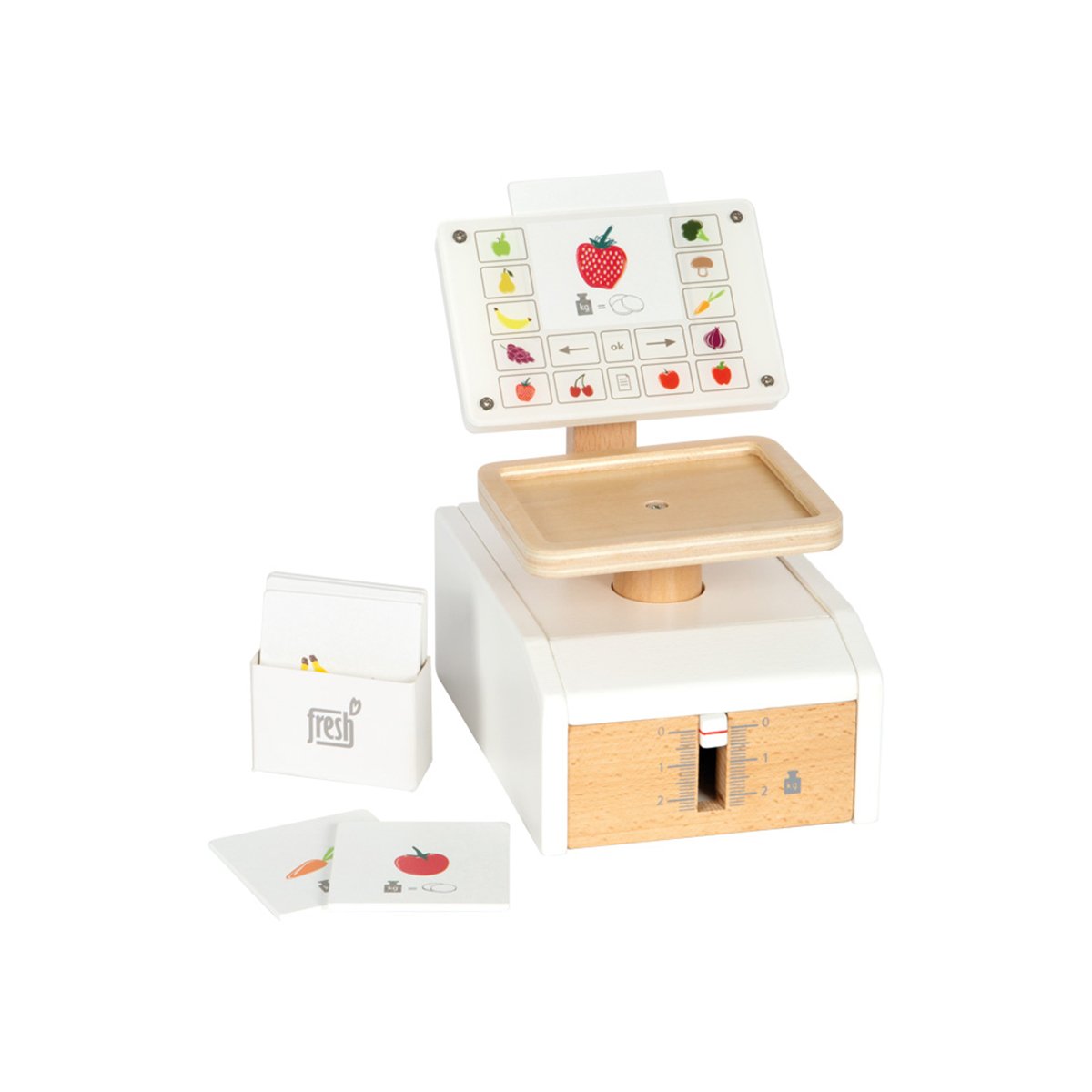 Претегляйте храната точно като в супермаркета! Тази дървена играчка везна с голяма повърхност е перфектният аксесоар за претегляне на играчки-храни в игралния магазин. Интегрираният пружинен механизъм осигурява особено реалистично изживяване при игра с подвижния индикатор и таблата за теглене, която се движи нагоре и надолу, когато нещо се постави отгоре. Големият „монитор“ има прозорец от плексиглас, покриващ изображения на бутони за докосване и илюстрации на плодове и зеленчуци. Шестте двустранни карти на плодове и зеленчуци допълват този комплект за ролеви игри и могат да се поставят на „дисплея“ отгоре.