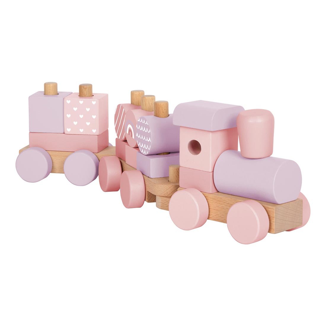 Пастелен дървен влак с 14 блокчета за комбиниране, локомотив и два вагона. Децата подреждат, сортират и дърпат влака, като усъвършенстват сръчността и координацията.