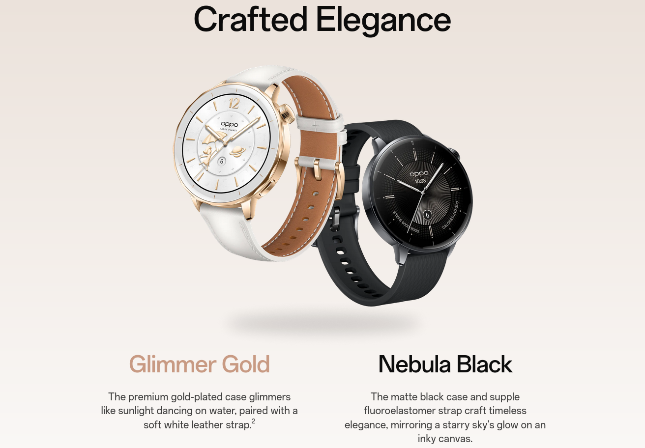 | Design & Material | Strap: Leather Strap (Glimmer Gold); Fluoroelastomer Strap (Nebula Black) |