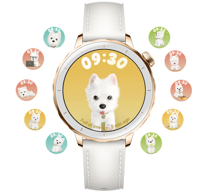 Cute puppy watch faces sync with your stress level and status, raise your wrist for a friendly check-in with your on-watch buddy.