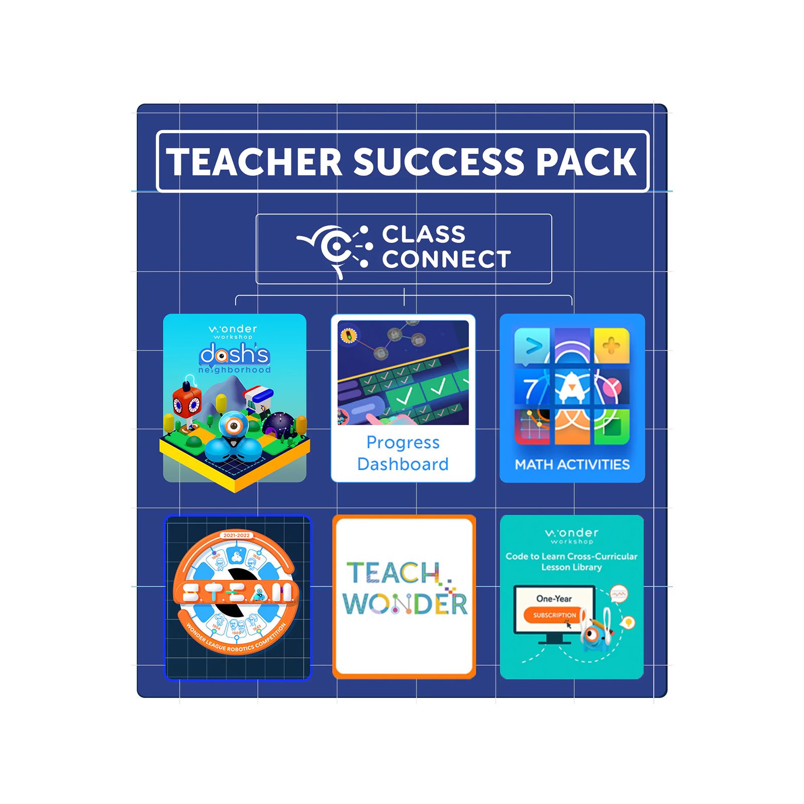 • Teacher Success включва лиценз за 1 учител и до 35 ученика с програмата Class Connect, която позволява следене на напредъка на всеки ученик, както и достъп до 3-D средата за програмиране на виртуален Dash - Dash's Neighborhood.