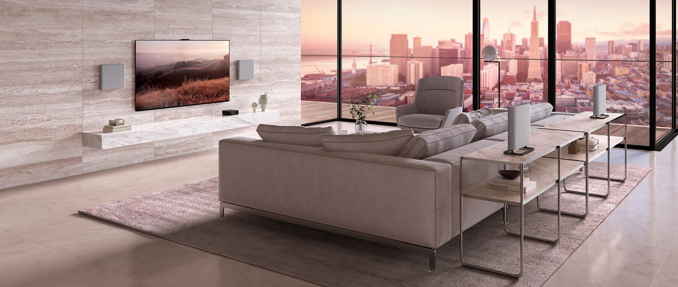 Система за домашно кино, проектирана да допълва вашия интериор, а не да го нарушава. С безжични високоговорители, които могат да бъдат монтирани на стена или да бъдат поставени като свободно стоящи, тя предлага идеална комбинация от удобство и стил.