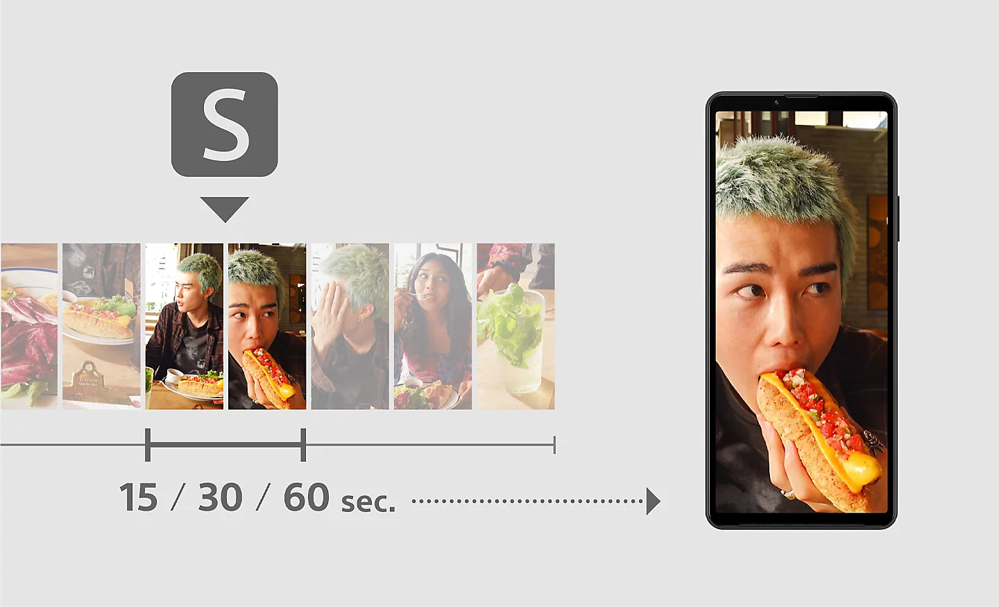 ![]() | Изберете най-добрата сцена Прехвърляйте само нужните сцени, спестявайки време и пространство за съхранение в смартфона. Добавяйки маркер на кадъра, докато снимате или гледате видео, можете да изрежете клип от 15, 30 или 60 сек. и да го изпратите на смартфона. Маркерите на кадъра ви помагат и да намерите сцената, която искате, спестявайки време от търсене на кадри. |