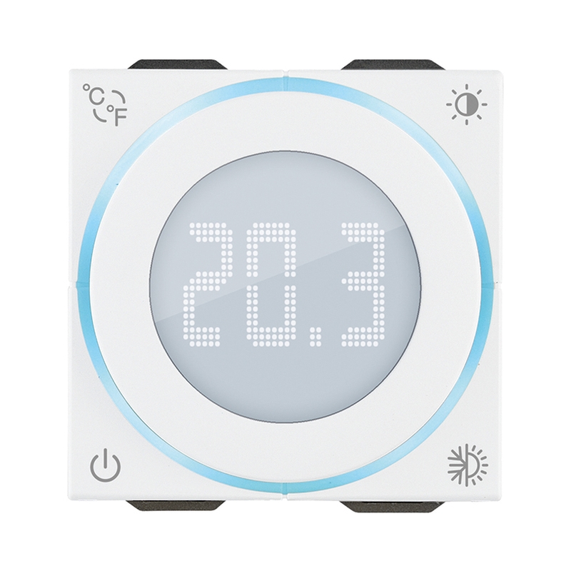 Стаен термостат с ротативен бутон и LED подсветка 100-240V 2M Бял Neve Up. Прецизен контрол на температурата – от 4°C до 40°C, ON/OFF управление – за отопление и охлаждане, LED подсветка с регулируема яркост, въртящ се диск + 4 бутона за интуитивно управление, безшумен релеен изход: 5(2) A, 240V – за директно управление на нагревател или климатик, регулиране с точност на 0.3 °C, компактен и елегантен дизайн.