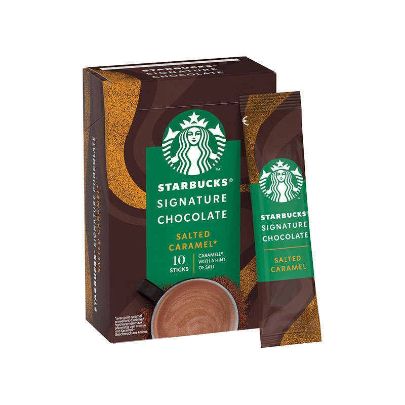 Когато шоколада срещне карамела! Подгответе вкусовите си рецептори за STARBUCKS® Signature Chocolate какао на прах с вкус на солен карамел и поглезете себе си с една шоколадова чаша, наслаждавайки се на уютен момент в края на деня. Вдъхновени от Starbucks® Горещ шоколад, който всички обичаме, ние създадохме за вас този карамелено горещ шоколад на прах, със солени нотки, който да си приготвите у дома. Нашият STARBUCKS ® Signature Chocolate е наситен с вкусни солено карамелени нотки . Просто разбъркайте с топло мляко за върховно шоколадово изживяване глътка след глътка.