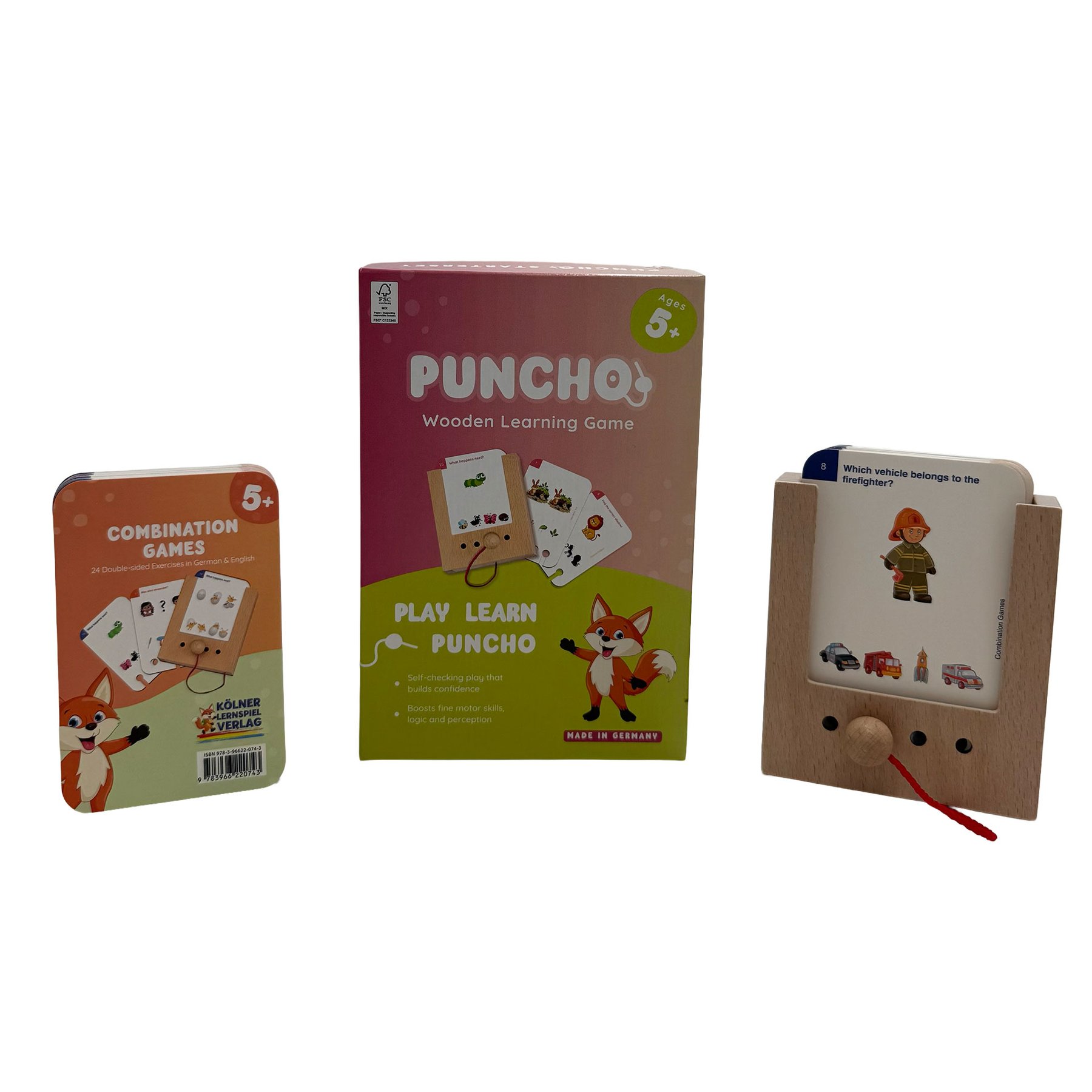 Детето поставя карта с картинка или въпрос в плъзгащия се слот и избира отговор, като вмъква дървеното колче в съответния отвор. При правилен отговор картата може да бъде извадена; при грешен – остава на мястото си. Този механизъм осигурява ясна и непосредствена обратна връзка, насърчава самостоятелната проверка и изгражда увереност в ученето.