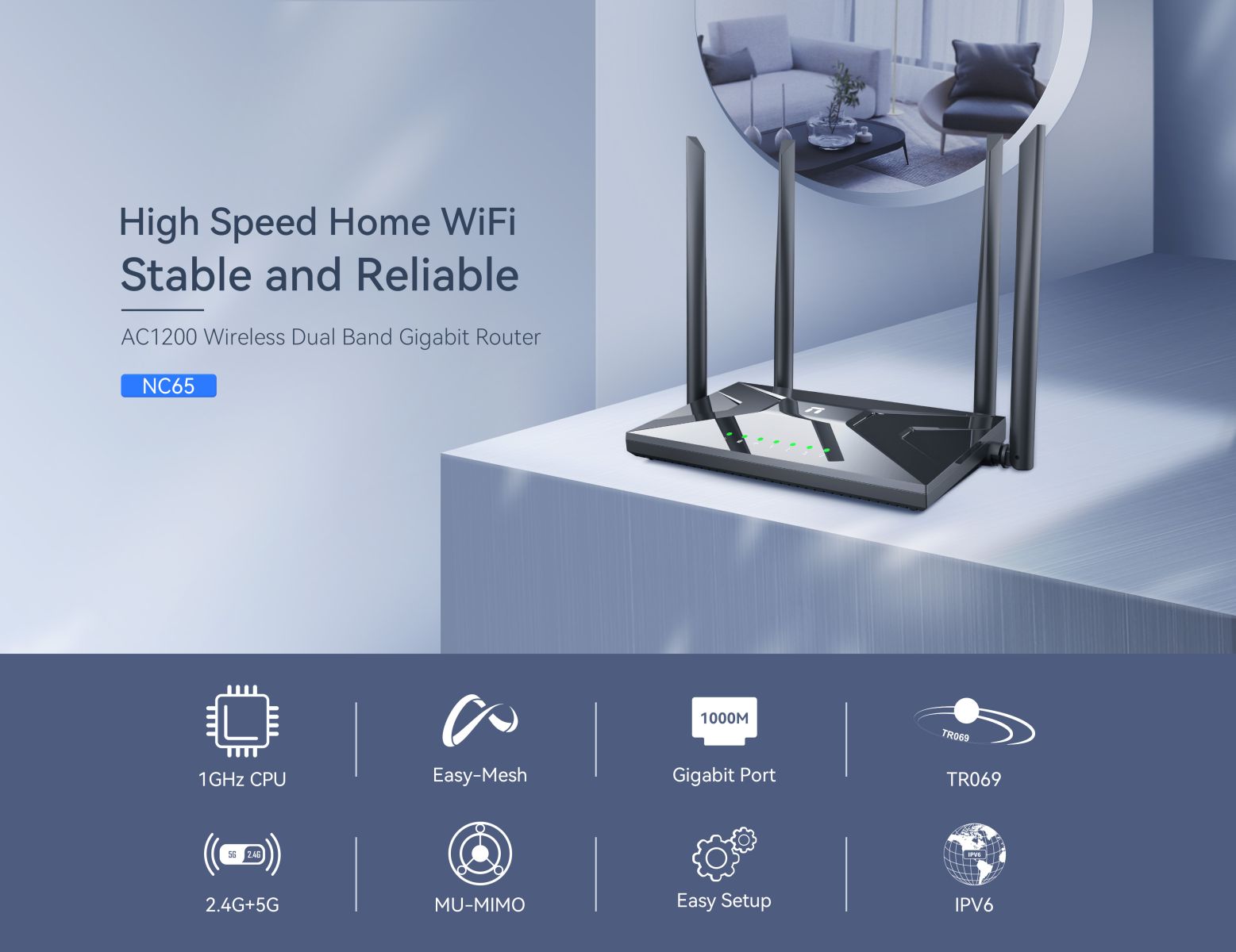 Equipped with Realtek 1GHz high performance SoC, the router NC65 becomes the most powerful 802.11AC Wi-Fi router, with full gigabit ports and perfect data transfer performance, can run stably in up to 800M bandwidth accessing environment, Also offer you simultaneous dual band connection with 867Mbps wireless speeds over 5GHz band and 300Mbps over 2.4GHz band.