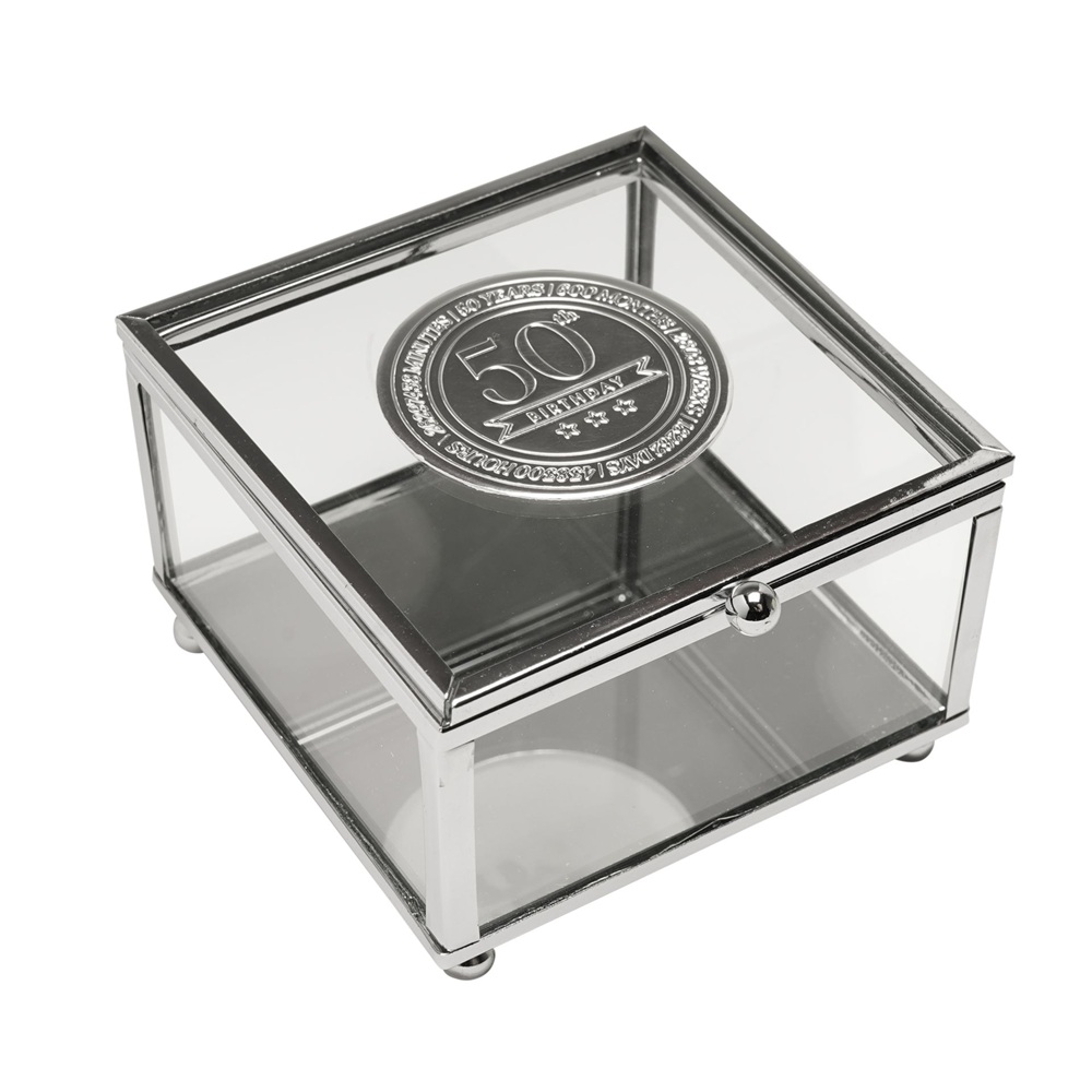 Стъклената кутия за бижута Milestones с метална значка “50“ е стилен сувенир, предназначен да отбележи знаменателен 50-ти рожден ден. С прозрачни стъклени панели и метална значка „50“, вградена в капака, тази кутия за бижута предлага изискан начин за съхранение на бижута, сувенири или малки сувенири.
