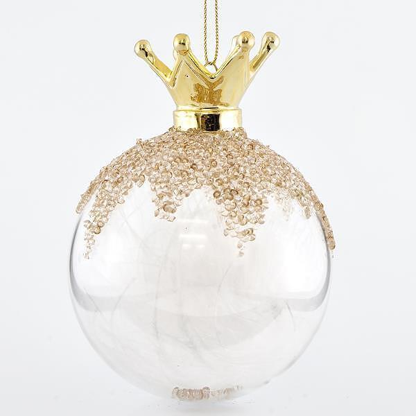 - Дизайн: Прозрачни стъклени топки, декорирани с деликатна коронка и нежно перо за изтънчен вид.