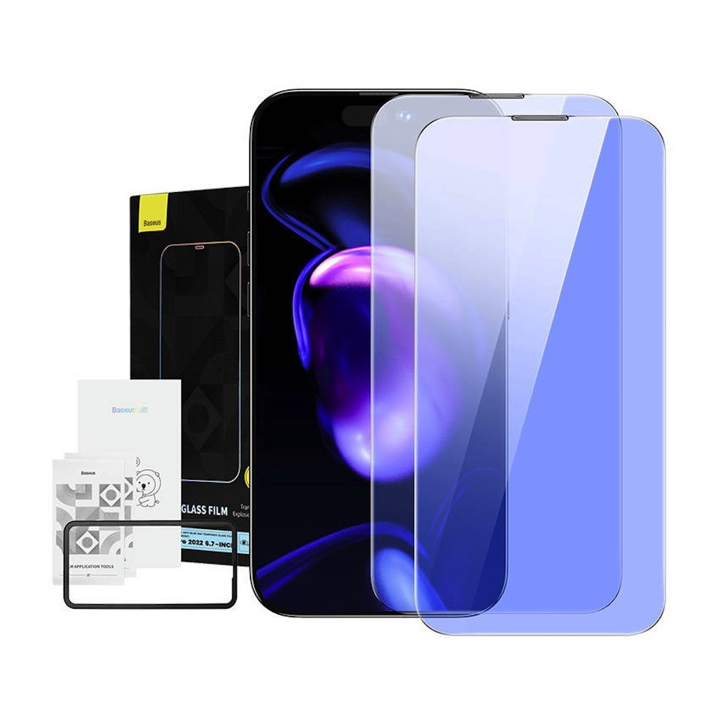 Стъклено защитно покритие за целия дисплей на iPhone 14 Pro Max (прозрачен) - Baseus Full Coverage Anti Blue Light Dust Proof Tempered Glass Film Set (SGBL120302) (2 броя)