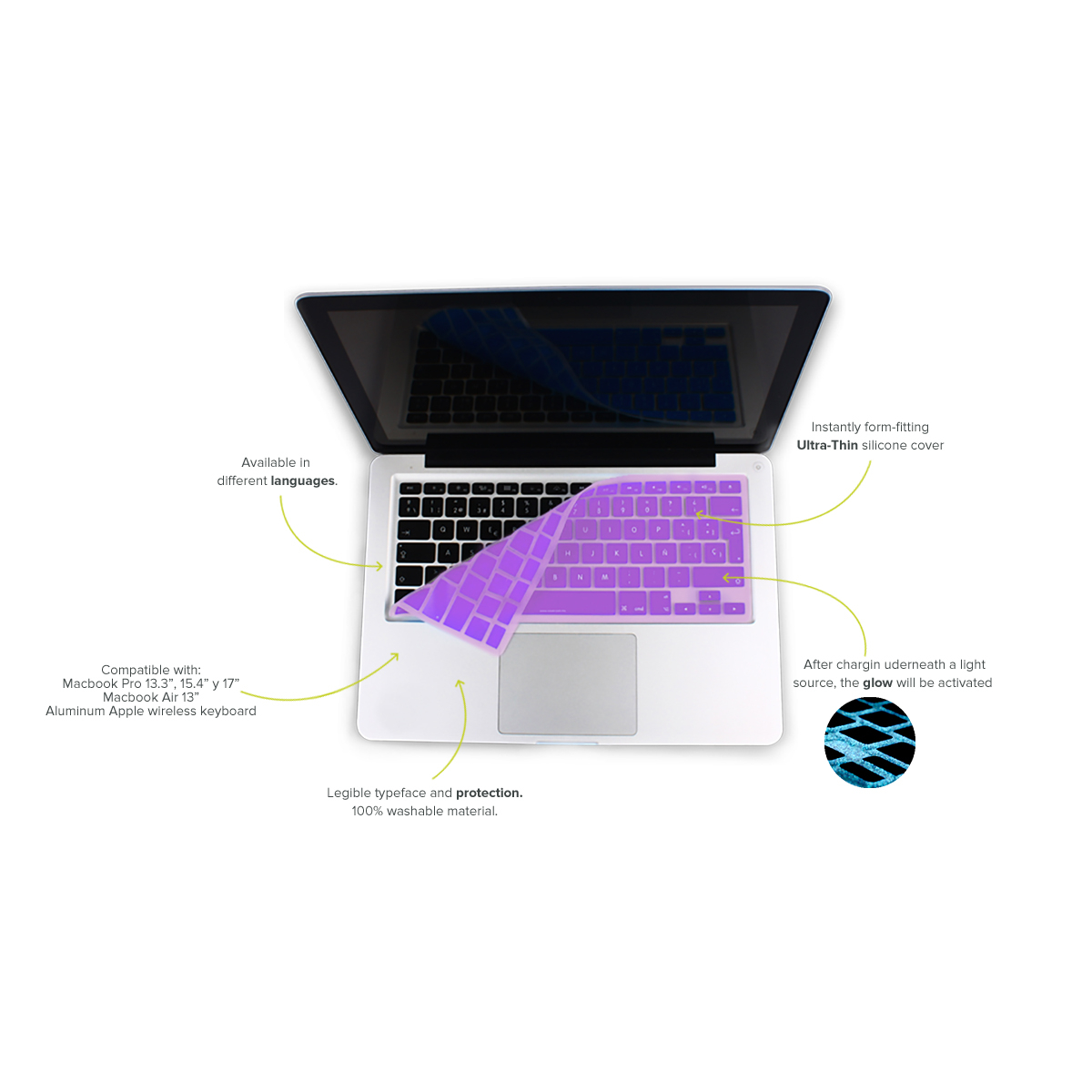 Светещ в тъмното силиконов протектор за Apple и MacBook клавиатури - iCover Glow In Dark Keyboard Lifesaver (лилав)