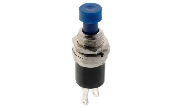 Тип превключвател: бутон с кръгъл клавиш, Начин на превключване: OFF-(ON), Общ брой положения: 2, Брой устойчиви положения: 1, Брой неустойчиви положения: 1, Брой нa изводите: 2, Максимален допустим ток при 250V AC: 1A, Максимален допустим ток при 125V AC: 3A, Тип нa изводите: за кабелна обувка 2мм, Брой на превключваните вериги: 1, Габаритни размери (Д/В): 9x27мм, Диаметър на монтажния отвор: 6мм, Цвят на клавиша: син, Цвят на корпуса: черен