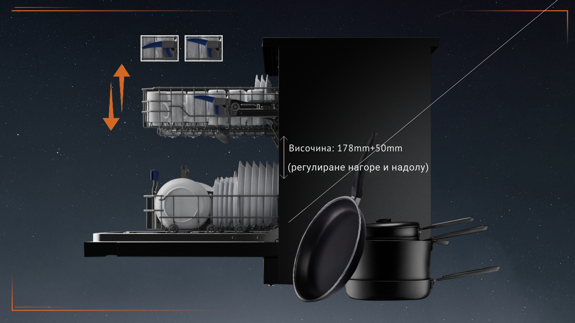 Горната кошница е с повдигащ се механизъм. Чрез регулиране на височината на рафта, долната кошница може лесно да побере дълбока тенджера и други големи съдове.