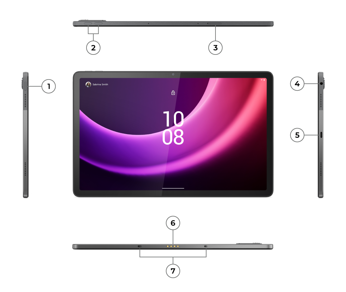 1. Бутон за включване 2. Бутон за намаляване/увеличаване на звука 3. Слот за MicroSD карта 4. Комбиниран жак за слушалки/микрофон | 5. USB-C 2.0 6. 4-точков pogo пин 7. Pogo пин конектори |