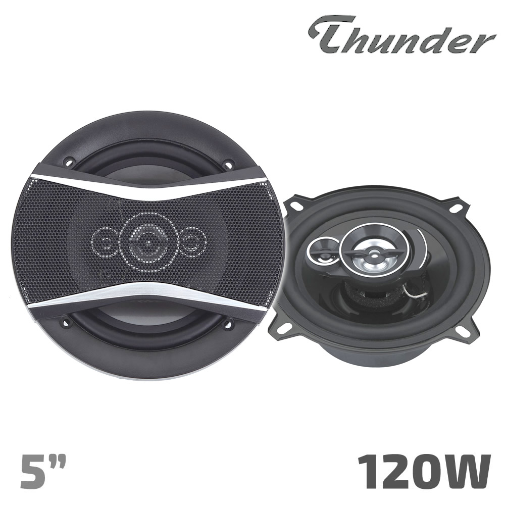 5" (13см) Трилентови автомобилни говорители THUNDER, Съпротивление 4Оhm, Максимална мощност 120W, Честотна лента: 65Hz-20KHz, Чувствителност 88dB, Черен шприцован полипропиленов конус, Магнит-5.4Oz, Черна гумена гънка, Решетки и кабели за монтаж, Комплект 2броя