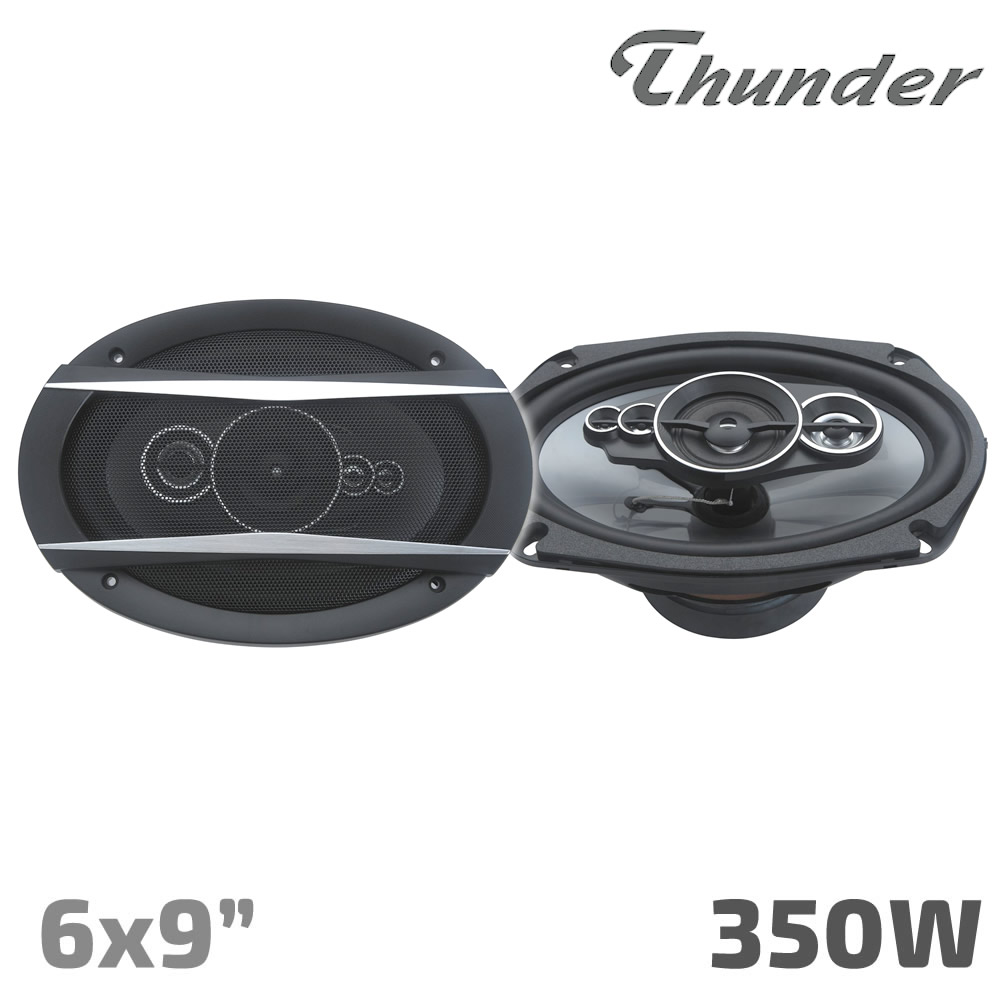 6х9" (15х23см) Петлентови автомобилни говорители THUNDER, Съпротивление 4 Ohm, Максимална мощност: 350W, Честотна лента: 45Hz-22KHz, Чувствителност: 91dB, Черен шприцован полипропиленов конус, Магнит- 30Oz, Черна гумена гънка, Решетки и кабели за монтаж, Kомплект: 2броя