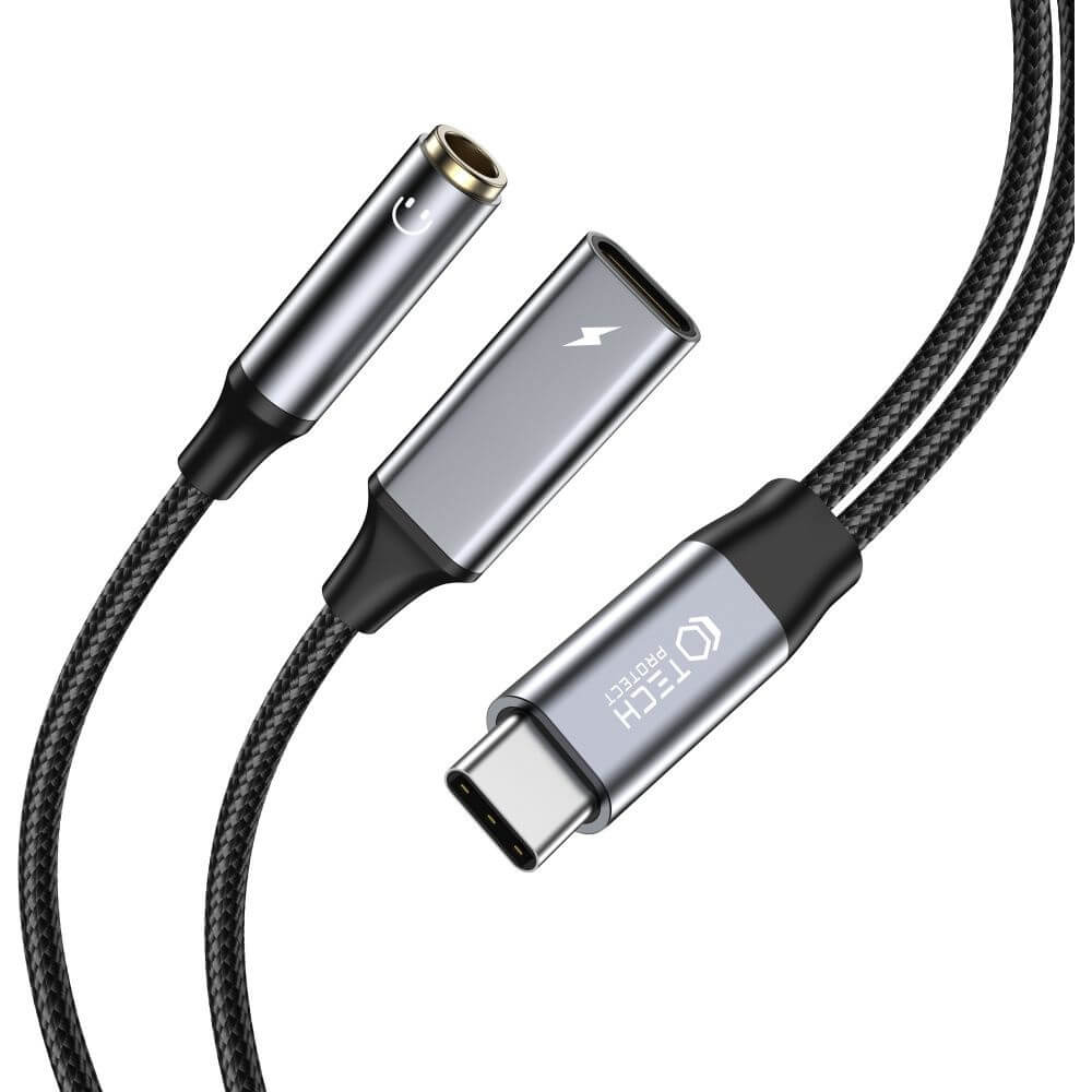 Tech-Protect Ultraboost USB-C to 3.5mm Adapter - USB-C адаптер към 3.5 аудио изход и USB-C изход (15 см) (черен)