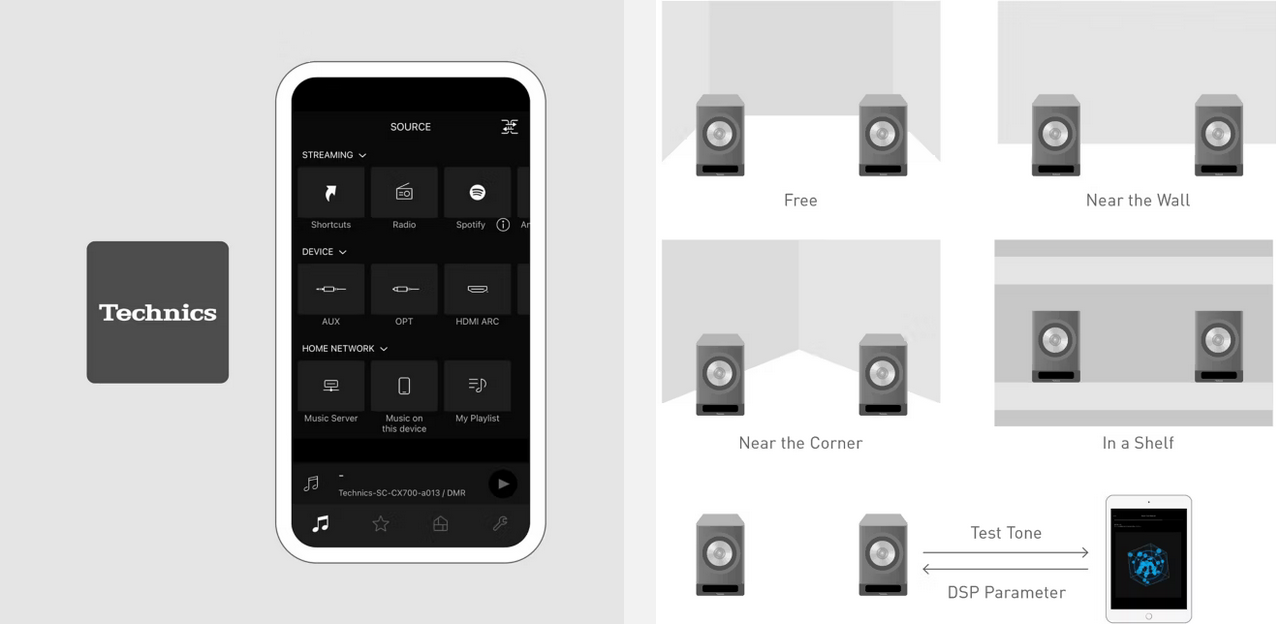 Лесното за използване приложение Technics Audio Center Приложението Technics Audio Center допълнително подобрява оперативността на SC-CX700. Приложението се предлага с четири основни функции: ИЗТОЧНИК, ЛЮБИМИ, СТАЯ и НАСТРОЙКИ. Превключването на възпроизвежданото съдържание и настройките на устройството може да се направи интуитивно. | Space Tune ви позволява да регулирате качеството на звука, за да отговаря най-добре на околната среда SC-CX700 е оборудван с три функции Space Tune. |