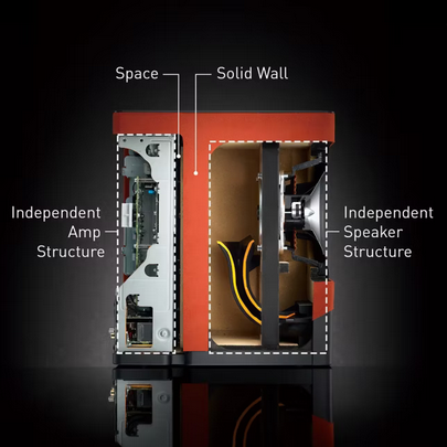 ![]() | Конструкция Acoustic Solitude Кутиите на усилвателя и високоговорителя имат отделни структури и разстояние, за да се сведат до минимум вибрациите, предавани към усилвателя, и да се постигне чист звук. |