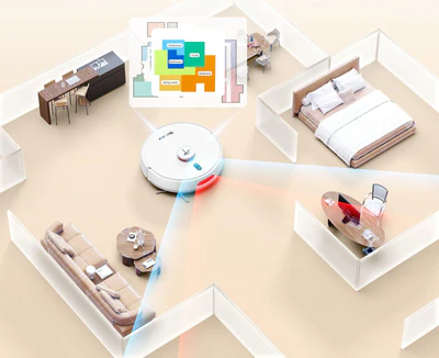 Accurate home map construction,Cleaning coverage up to 99.6%.Intelligent identification of furniture locations, memory of multi-story apartment types, efficient planning of optimal routes.