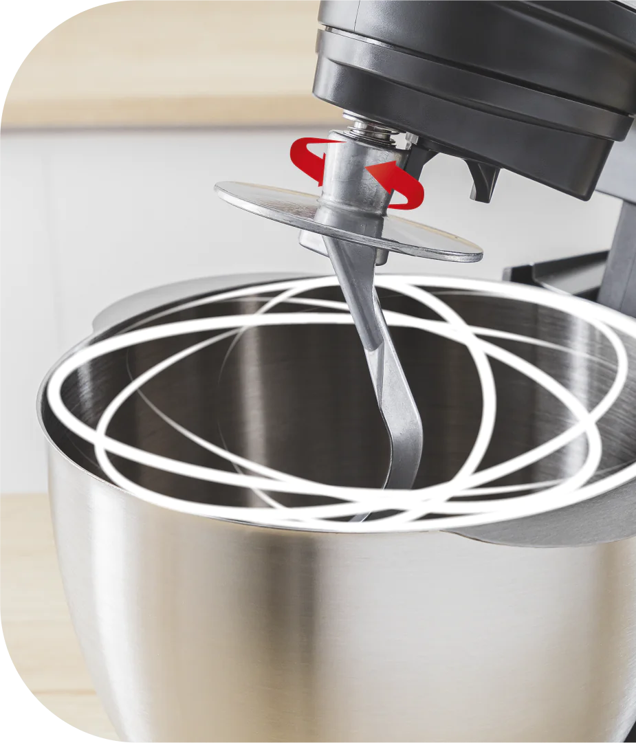 Планетарен режим на ротация Равномерното и висококачествено смесване на съставките се постига благодарение на планетарното движение на приставките, което обхваща всеки сантиметър от купата. | ![]() |