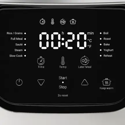 Многофункционалност при готвене Насладете се на 10 програми за готвене: ориз/зърнени храни, цяло ястие, сотиране, готвене на пара, бавно готвене, варене, печене на фурна, печене, кисело мляко, претопляне. | ![]() |