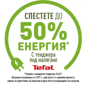 *Спрямо стандартна тенджера Tefal®. Вътрешно проучване от 2017 г., при което се сравнява времето, нужно за приготвяне на броколи и зрял боб и консумацията на енергия.