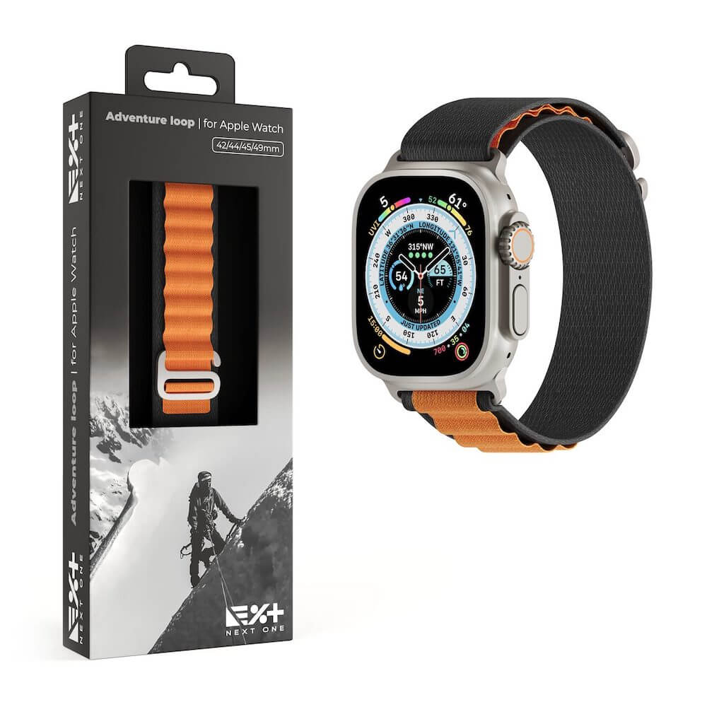 Текстилна каишка за Apple Watch 42мм, 44мм, 45мм, 46мм, Ultra, Ultra 2 49мм - Next One Adventure Loop (черен-оранжев)