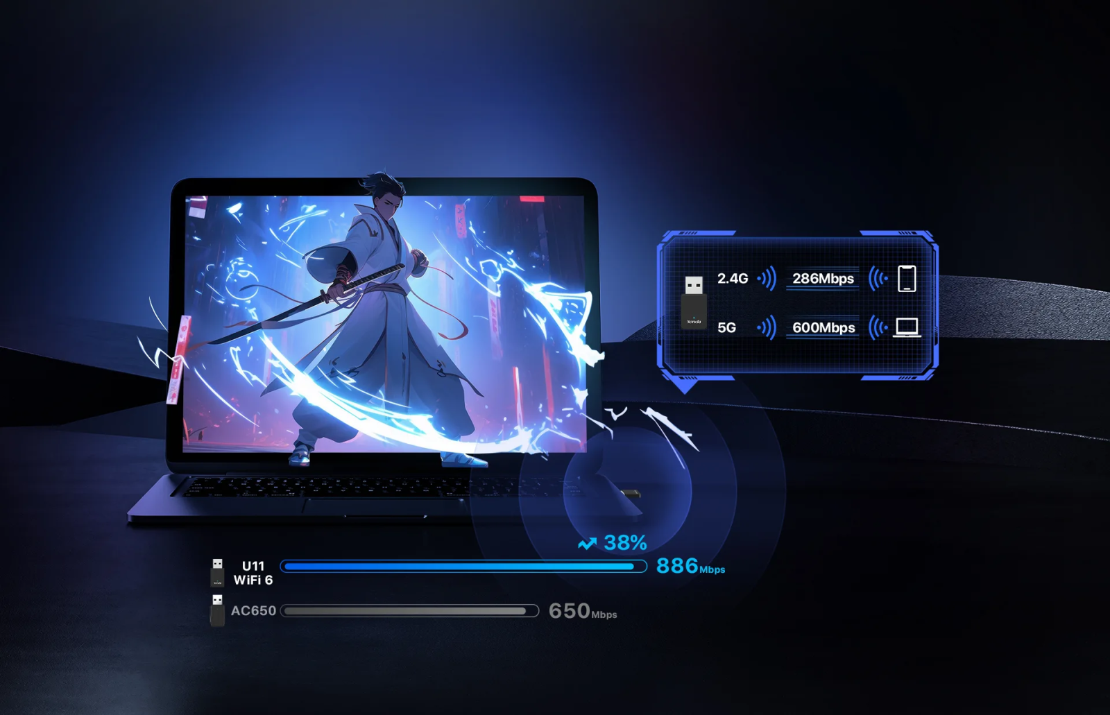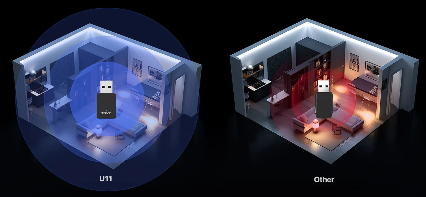 Compared with previous Wi-Fi 5 adapter, the Tenda intelligent algorithm used by U11 can better assist the stable transmission of wireless signals and make the wireless transmission range wider.