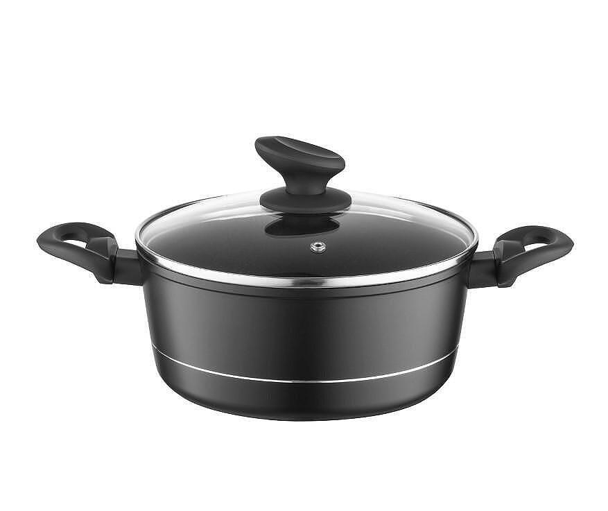 Съд от ковано алуминий с незалепващо покритие AntiScratch, устойчиво на надраскване и лесно за почистване. Благодарение на системата Heating Control System топлината се разпределя равномерно и се предотвратява прегряване. Термоизолираните дръжки Soft Touch осигуряват комфорт и безопасност. Елегантният дизайн в черно със сребрист акцент и стъклен капак го правят стилен избор за всяка кухня. Подходящ за всички видове котлони, включително индукционни.
