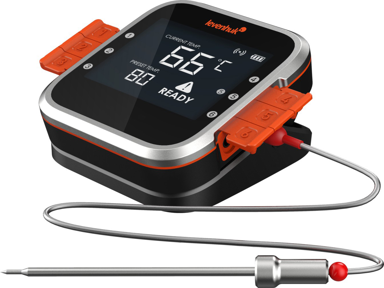 </ul><table><tbody><tr><td>Марка</td><td>Levenhuk, Inc., USA</td></tr><tr><td>Гаранция</td><td>доживотна</td></tr><tr><td>EAN</td><td>5905555027449</td></tr><tr><td>Размер на опаковката (Д x Ш x В)</td><td>19x18x5 cm</td></tr><tr><td>Транспортно тегло</td><td>0.7 kg</td></tr><tr><td>Конструкция</td><td>с дистанционна сонда</td></tr><tr><td>Тип на сондата</td><td>жична</td></tr><tr><td>Брой на включените сонди</td><td>3</td></tr><tr><td>Максимален брой сонди</td><td>6</td></tr><tr><td>Материал на сондата</td><td>неръждаема стомана</td></tr><tr><td>Измервателни единици</td><td>°C, °F</td></tr><tr><td>Подходяща за фурна</td><td>yes</td></tr><tr><td>Диапазон на измерване на температурата на ястието, °C</td><td>0 — 300</td></tr><tr><td>Точност на измерването</td><td>±1% (0 °C до +100 °C); ±2% (+100 °C до +200 °C); ±3% (+200 °C до +300 °C)</td></tr><tr><td>Функция "Задържане"</td><td>yes</td></tr><tr><td>Предупреждение за надвишена температура</td><td>yes</td></tr><tr><td>Таймер</td><td>yes</td></tr><tr><td>Обратно броене на таймера</td><td>до 11 ч. 59 м. 59 сек.</td></tr><tr><td>Свързаност със смартфон</td><td>yes</td></tr><tr><td>Възможност за свързване на допълнително оборудване</td><td>смартфони и таблети с Android/iOS чрез приложението ToGrill</td></tr><tr><td>Bluetooth</td><td>yes</td></tr><tr><td>Обхват на пряка видимост</td><td>до 60 m (до смартфон)</td></tr><tr><td>Тип на екрана</td><td>монохроматичен</td></tr><tr><td>Фоново осветление</td><td>yes</td></tr><tr><td>Захранване</td><td>2 x AA batteries, 1.5V (not included)</td></tr><tr><td>Индикатор за състояние „изтощена батерия“</td><td>yes</td></tr><tr><td>Автоматично изключване на захранването</td><td>yes</td></tr><tr><td>Тяло</td><td>издръжлива пластмаса ABS, неръждаема стомана</td></tr><tr><td>Магнит върху задната част</td><td>yes</td></tr><tr><td>Водоустойчив</td><td>yes</td></tr><tr><td>Клас на защита от влага/проникване на вода</td><td>степен на защита IP65, пълна защита от прах, защита от водни струи (само за сондите)</td></tr><tr><td>Сертификации</td><td>CE, FCC, RoHS</td></tr><tr><td>Допълнително</td><td>силиконови тапи за портове на сондата, стойка</td></tr></tbody></table>
