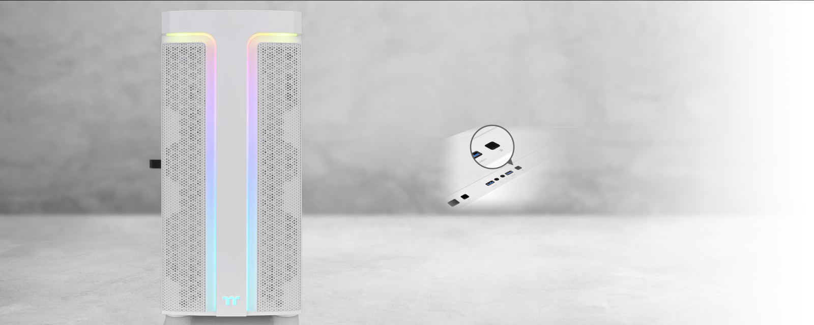 H590 TG ARGB mid-tower chassis has a unique design of the front panel, featuring two RGB lighting strips around the T shape. Its lighting effects can be controlled by the physical RGB button on the I/O panel or motherboard software from ASUS, GIGABYTE, MSI, and ASRock.