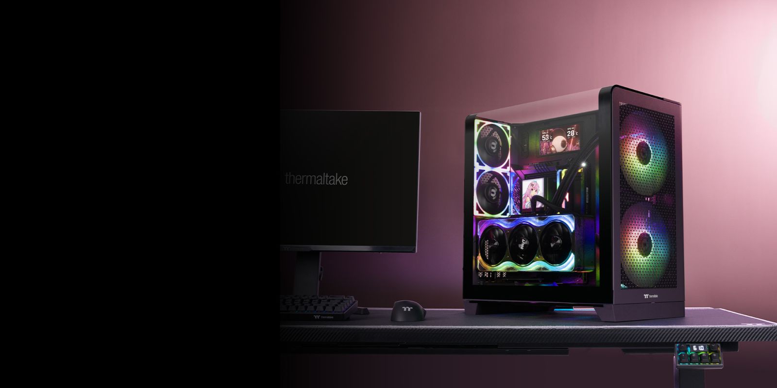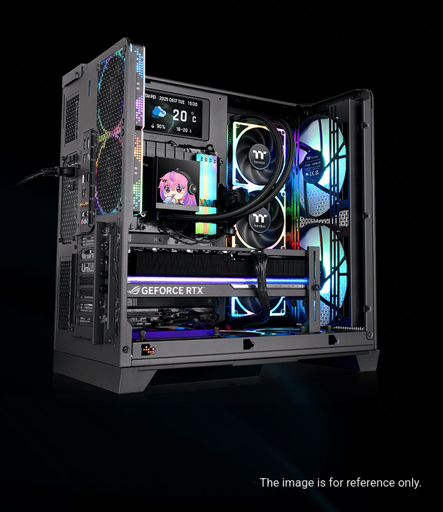 The View 390 Air Mid Tower Chassis is an ATX case with a curved tempered glass side and top panel, a perforated front panel, rotational PCI-E slots, a GPU bracket and two CT120 rear fans. It can fit up to eleven 120mm fans, and supports a 360mm AIO radiator at the front or motherboard side. An optional 6" LCD Screen Kit can be added for real-time system information and enhanced visuals.