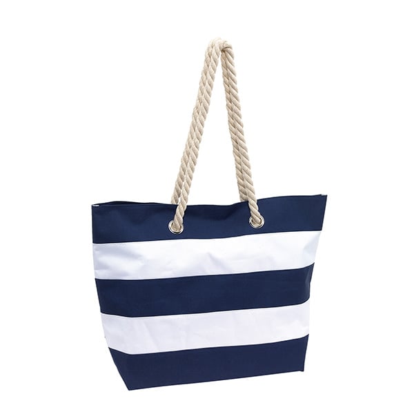 • Плажна чанта Sylt. Десенът е морско райе. Чантата е с голямо основно отделение с велкро затваряне. Включва допълнителен джоб с цип за ценни предмети. Двете дръжки са памучни, тип въже. Отворите за дръжките са с декоративни метални халки.